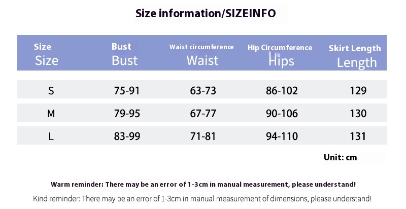 - S: Bust 75–91 cm | Waist 63–73 cm | Hips 86–102 cm | Length 129 cm